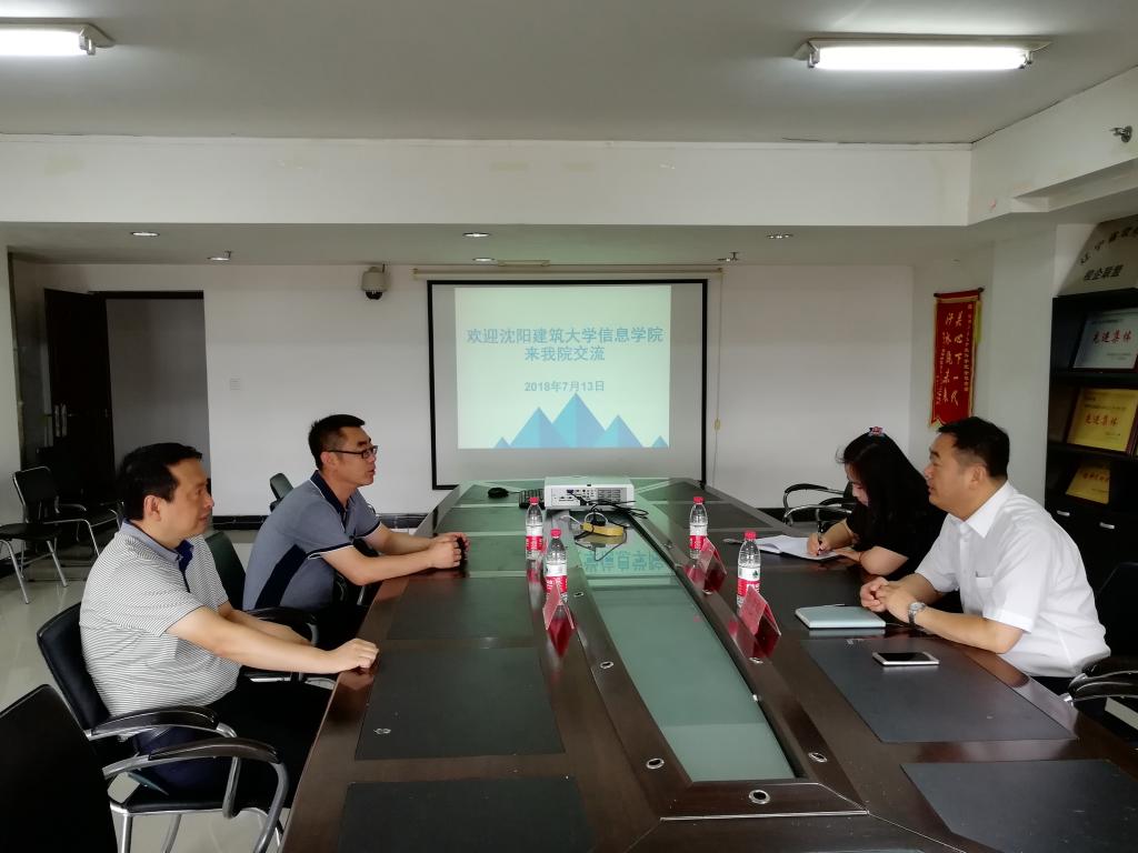 2018年7月13日,沈阳建筑大学信息学院副院长许景科、教务处黄喜来一行来到yl88858永利中国,就“校企协同育人”进行工作交流。yl88858永利中国副院长张志佳、教学办公室彭新茗等会见了来访客人。