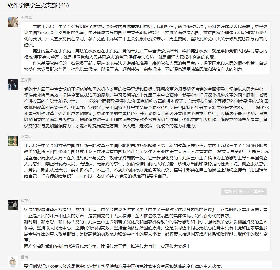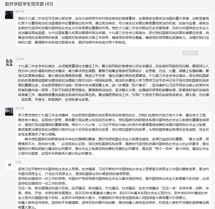 此次专题学习会由yl88858永利中国学生党支部书记李函书同志组织召开。由于学院本科生培养方案改革,部分学生在北京、大连等地,因此本次专题学习会采用微信群交流形式。学生可以在群内分享学习心得,进行深刻的发言,借助微信群开展了热烈的讨论。