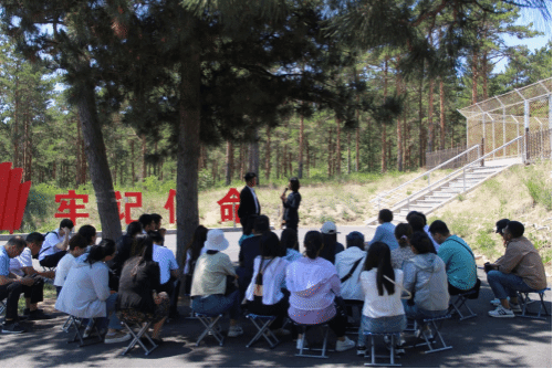 在万亩松林试验区的守望塔下,大家围坐在彰武松旁,工作人员讲述试验区从寸草不生的沙地变成林海的故事,为大家上了一堂生动的微党课。