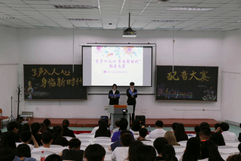 12个班级14个作品在两个月的时间里经过多次筛选,最终6个班级脱颖而出,成功晋级决赛。在主持人介绍完评分标准后,各参赛队伍按顺序依次上台进行现场配音,一场精彩纷呈的视听盛宴徐徐展开!