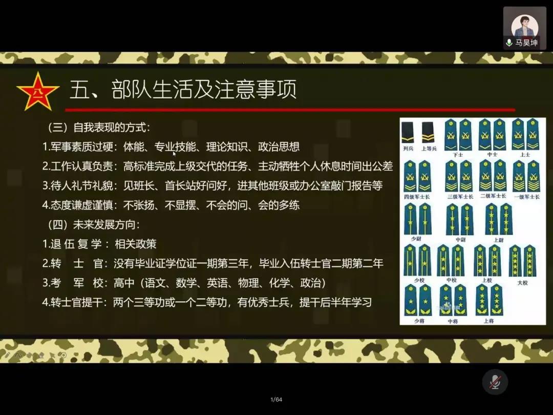 会议伊始,马昊坤同学首先就2020年征兵的程序、范围、报名方式、报名条件、经济优待政策,以及直招士官有关流程进行了详细的解读。同时结合自身的军旅生活,从部队的规律作息、严格政治制度、自我表现方式和未来发展方向四个方面让同学们对军队生活和自己的未来发展有了更清晰的框架,激发了学生们参军入伍的热情。