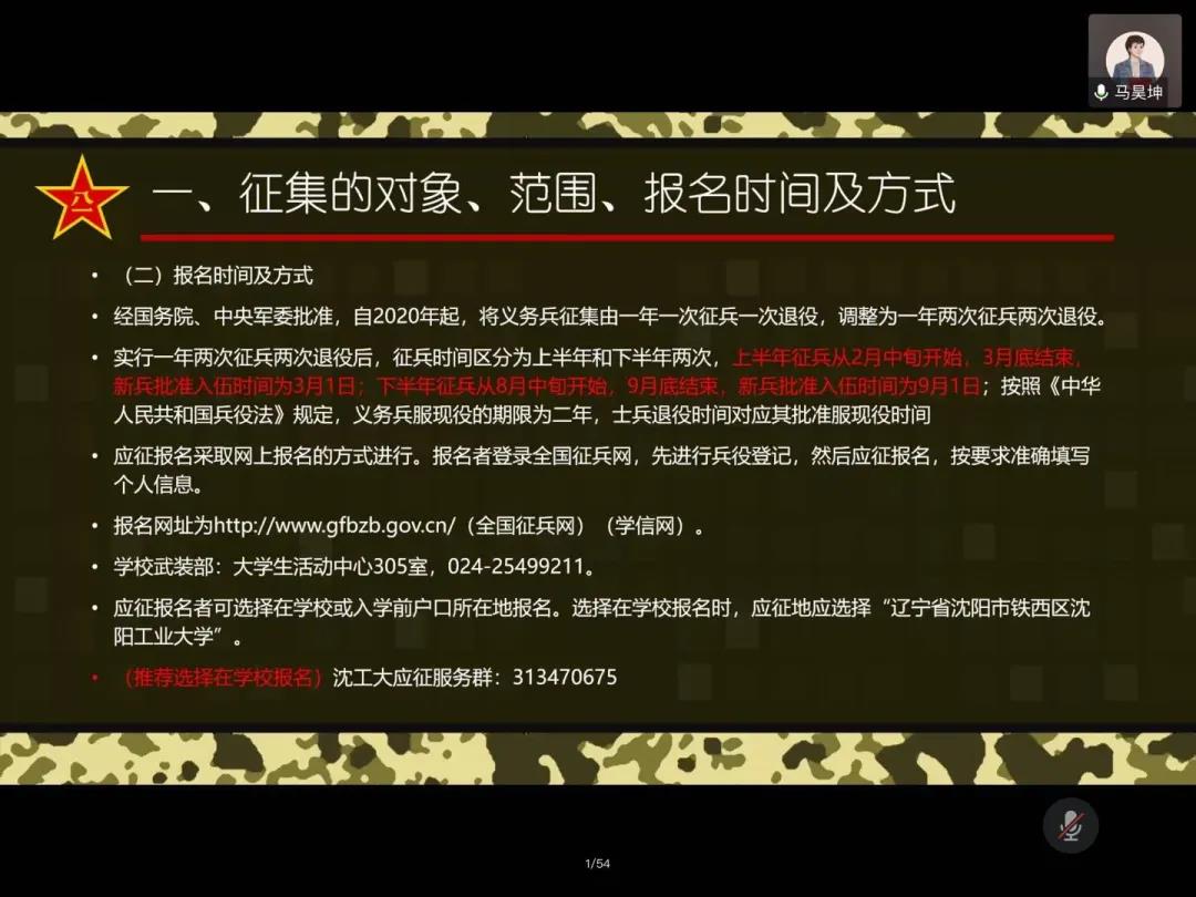 宣讲人马昊坤:2016年就读于yl88858永利中国,2016年9月入伍,曾先后服役于4个部队,于2018年9月退伍复学,担任第四届国旗护卫队指导员一职。2019年3月,投身校武装部迷彩社团,成立集训队并执行2019级新训教官培训任务。