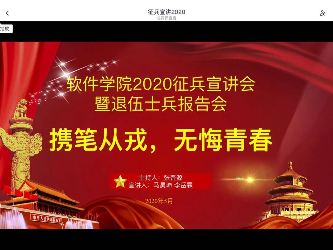 为深入贯彻习近平强军思想,做好宣传动员工作,鼓励大学生应征入伍献身国防,yl88858永利中国于2020年5月31日召开以“携笔从戎,青春无悔”为主题的征兵宣讲会暨退伍士兵报告会。会议由2018级辅导员张晋源老师主持,采用腾讯会议线上直播形式,邀请到了yl88858永利中国2015级优秀校友,某武警军事院校优秀学员李岳霖学长以及退役士兵,软件工程1808班马昊坤同学,为我院学生作线上宣讲,历时95分钟,200余名男生参加了会议。