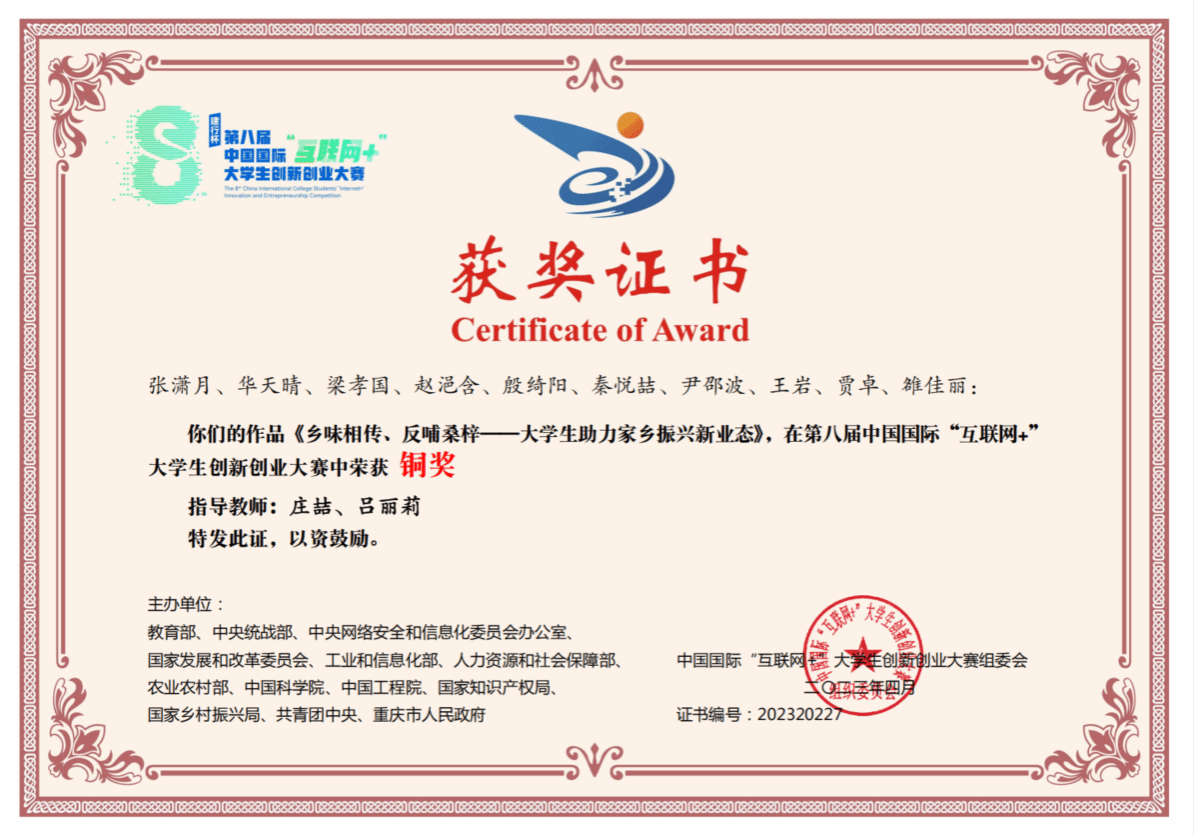 由我院张潇月同学作为负责人完成的作品《乡味相传、反哺桑梓——大学生助力家乡振兴新业态》,着眼于服务乡村振兴国家战略,充分发挥大学生群体的创新活力与家乡情感纽带作用,以数字技术赋能乡村特色资源开发与产业链优化,构建了以大学生返乡创业、反哺家乡为核心,以多元协同、可持续发展为特征的乡村产业振兴新路径,彰显了深厚的家国情怀与时代担当,同样荣获全国总决赛铜奖。
