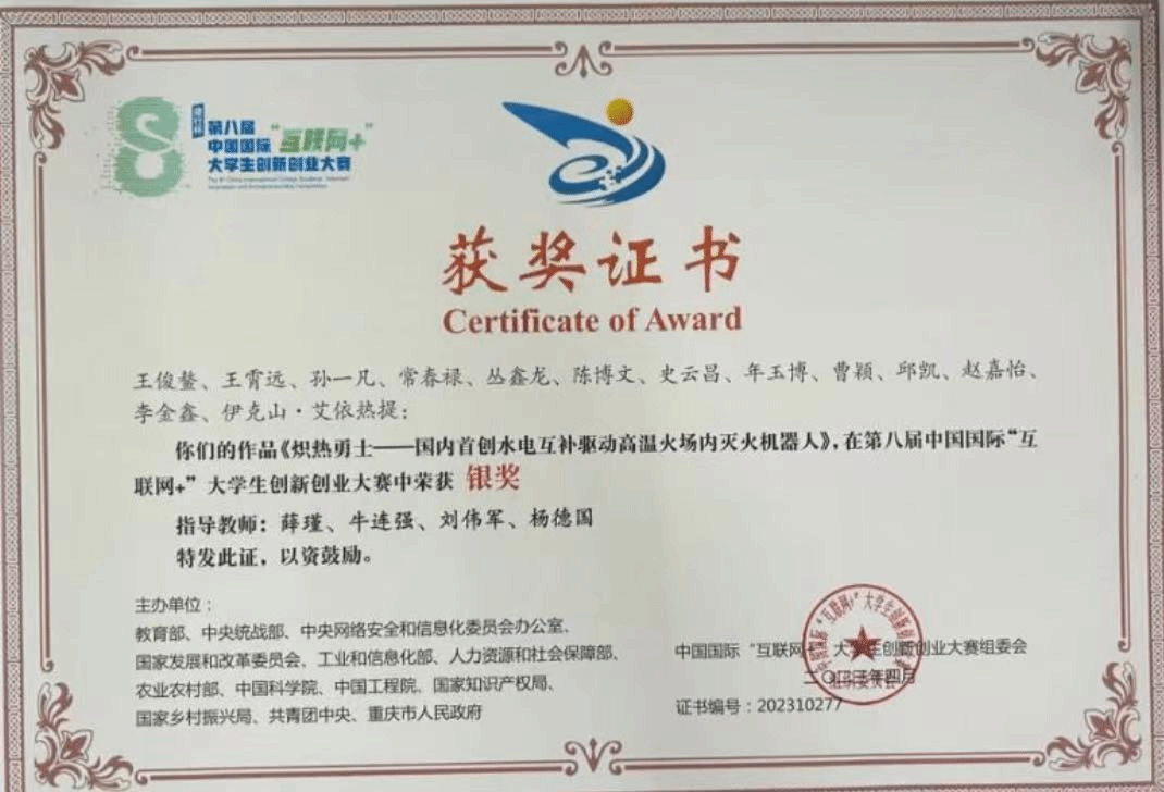 其中,由我院王俊鳌同学作为负责人完成的作品《炽热勇士——国内首创水电互补驱动高温火场内灭火机器人》,聚焦公共安全领域的重大需求,创新性地提出并实现了水电互补驱动方案,提升了机器人在极端高温火场环境下的持续作战与灭火能力,其前瞻性的设计理念与过硬的技术实力赢得了评委的高度认可,最终荣获全国总决赛银奖。