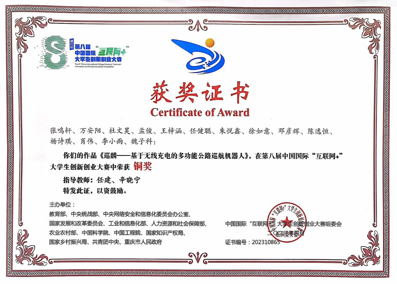 由我院张鸣轩同学作为负责人完成的作品《巡麟——基于无线充电的多功能公路巡航机器人》,瞄准智慧交通与基础设施智能运维领域,集成无线充电、智能感知与自主巡航等关键技术,为解决公路常态化巡检与维护提供了高效、节能的创新方案,荣获全国总决赛铜奖。